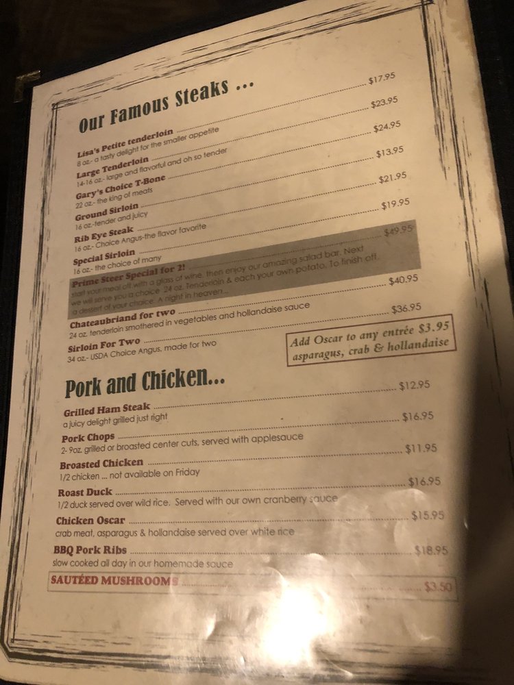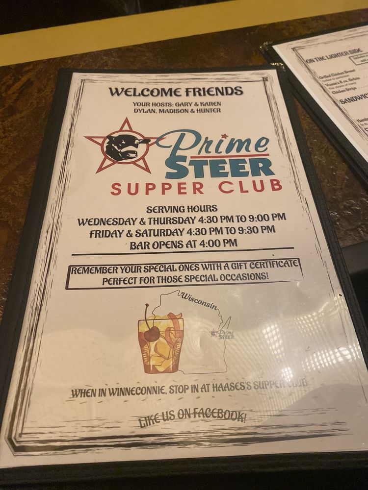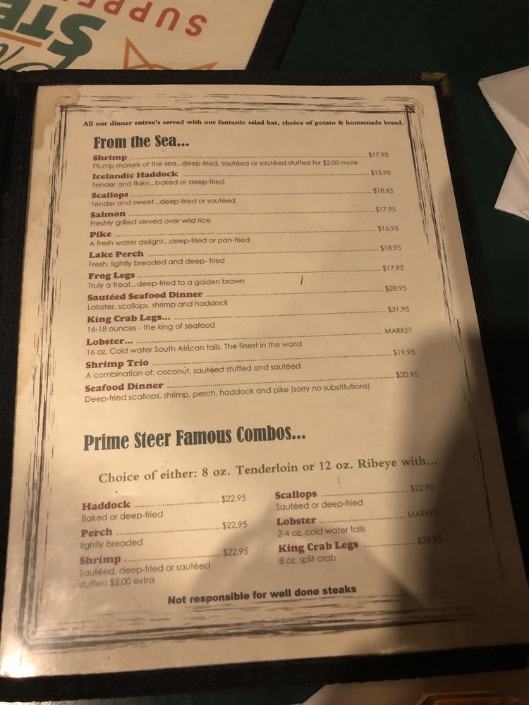 Prime Steer Supper Club in Kaukauna, WI, offers a delightful mix of steaks, seafood, pork, and chicken dishes in a welcoming atmosphere. Their famous Chateaubriand For Two and Lisa's Petite Tenderloin steal the show, along with flavorful options like Broasted Chicken and Chicken Oscar. From the sea, the Icelandic Haddock and Shrimp Trio offer a taste of the ocean. Customers rave about the quality of food and service, with many praising the cozy supper club vibes and perfectly cooked meals. The warm and soft fresh-baked bread, classic salad bar, and great selection of dishes make Prime Steer Supper Club a must-visit for steak and seafood lovers. The friendly environment, full bar, and attentive staff add to the overall dining experience, making it a prime choice for a satisfying meal.